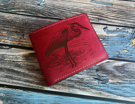 Mayan Corner - Grey heron leather men's wallet, custom engrave gift for him, Bird drawing art present, Gift for bird lovers