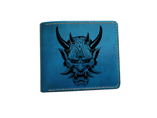 Personalized Japan ancient pattern leather men's wallet, Oni hannya demon evil mask art, horror wallet for men, halloween gift idea for him