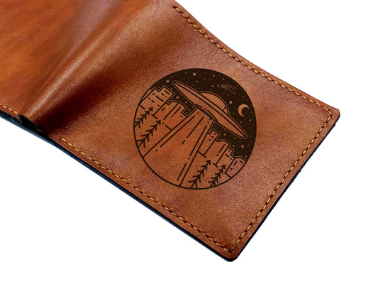 Alien UFO leather men's present, custom engrave gift ideas, Alien starship gift for boyfriend, leather anniversary fun art, wallet for boy