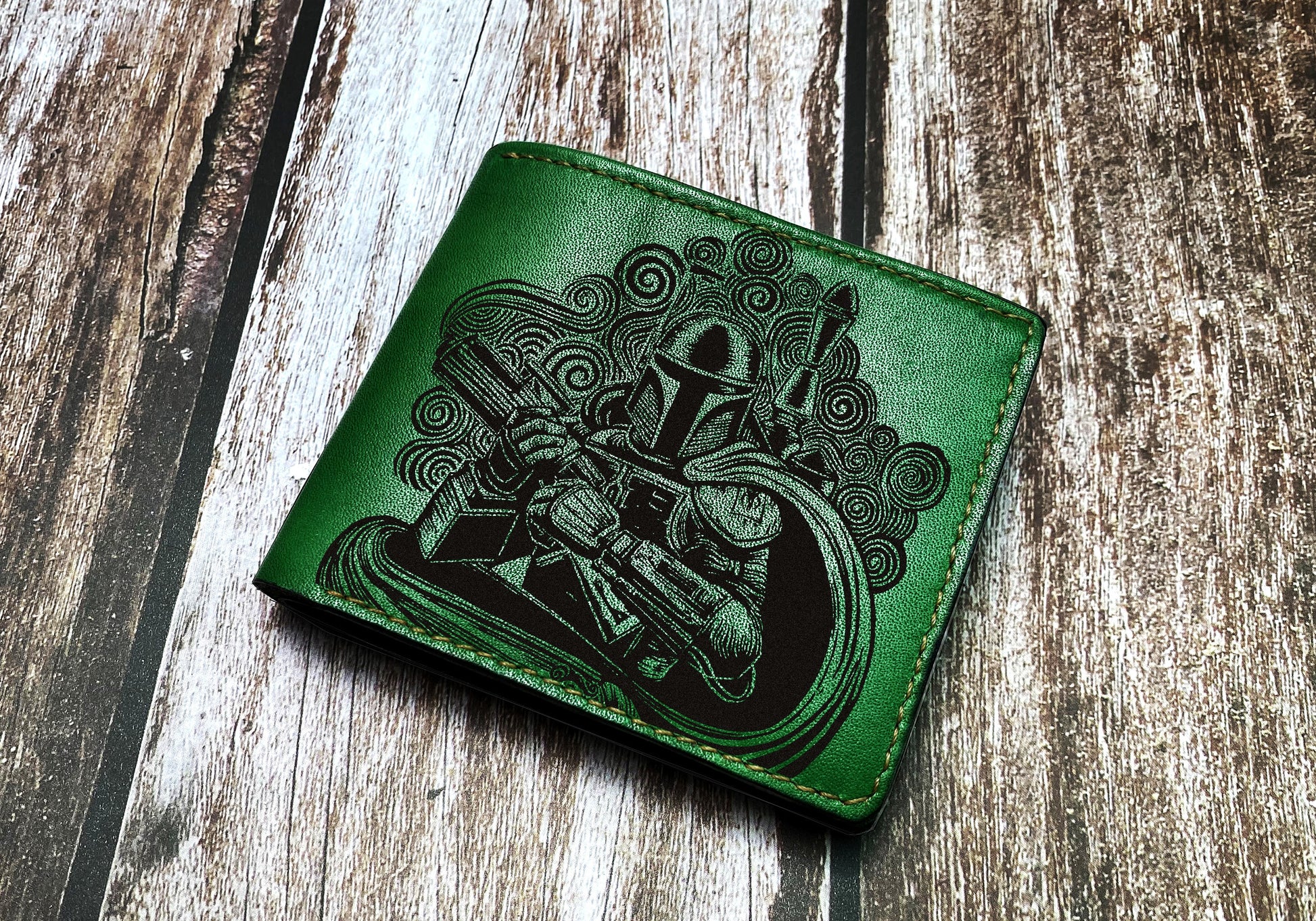 Starwars Mandalorian leather men's wallet, Boba Fett linocut drawing art, Starwars leather gift ideas for men